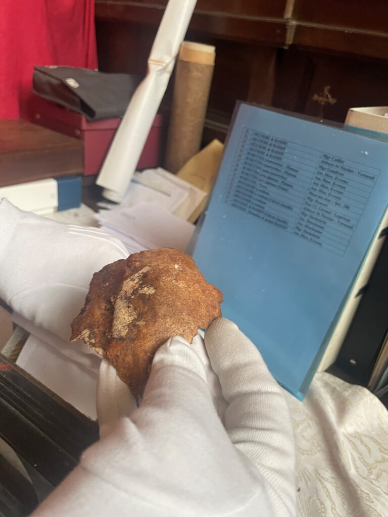 Og «tenk om» ble til «dette må vi få til», og alle gode krefter ble satt i sving. Vi hadde god tid, mente vi. Det var vel vinteren 23 at arbeidet begynte med et høflig brev til biskopen av Evreux, og så enda ett, og et til, det ble bispebytte både her og der, og korrespondansen fortsatte. På et tidspunkt, på forsommeren i år, ble det mail og telefoner og ikke brev. Adskillige telefoner til biskopen av Evreux» kurie ga resultater. Mandag 4. august kom meldingen om at dette kunne løses minnelig ved at noen kom og hentet relikvien, riktig nok med biskop Fredriks underskrift på at relikvien skulle ivaretas og oppbevares på verdig vis i St. Svithun menighet i Stavanger.