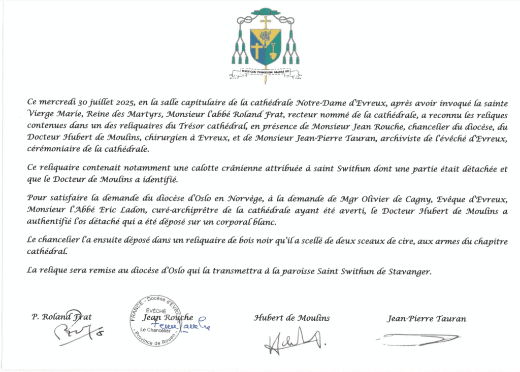 Denne onsdagen 30. juli 2025, i kapittelsalen ved katedralen Notre-Dame d’Évreux, etter å ha påkalt Den hellige Jomfru Maria, Dronning av Martyrer, bekrefter domprost abbé Roland Pautrat, rektor ved katedralen, i nærvær av monsieur Jean Moulins, kansler for bispedømmet, doktor Hubert de Moulins, monsieur Jean-Pierre Tatarin, domarkivar for bispedømmet Évreux, og seremonimesteren ved katedralen, at relikvariet i katedralens skattekammer i Évreux inneholdt en autentisk relikvie av den hellige Svithun, hvorav en del ble løsnet og identifisert av doktor de Moulins.