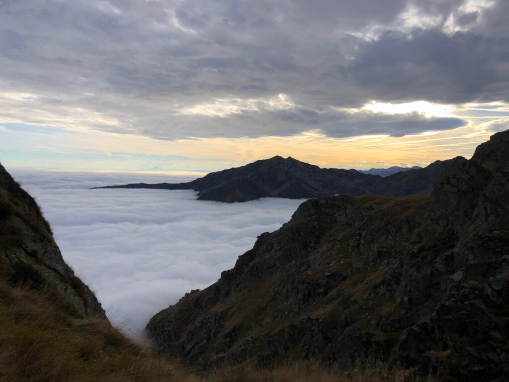 Fra høydene ligner skyene nedenfor et stille hav; bak dem synker solen og kaster sitt siste gyldne lys over den illusoriske horisonten.