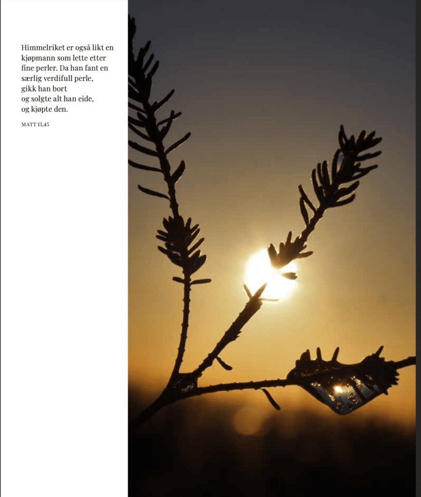 St. Olav forlag har laget mange vakre bøker, så jeg visste den ville være i trygg havn der visuelt sett. Det ble meg tidlig fortalt at den skulle være full av bilder. Det var en stor gave! Selv er jeg oppvokst i naturen og kjenner meg dypt tilhørende den. I årevis har jeg funnet stor glede i å ligge på bakken og fotografere små usynlige ting (for eksempel blomster) som man ikke oppdager når man springer fort forbi. Når noen av disse bildene er kommet med i boken så blir de en slags stadfestelse av den meditative holdningen, det lave, det stille, det ventende. Nøye utvalgte billedtekster, sammen med de fantastiske vakre ikonene skrevet av karmelittnonnene i Tromsø og Harissa i Libanon, eldre malerier av Karmels hellige osv., kan kanskje være små øyer, eller kanskje oaser i en til tider omfattende tekst.