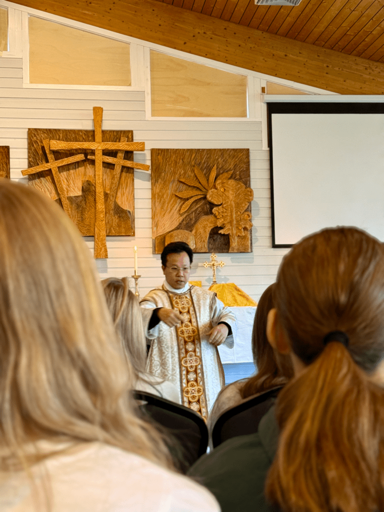 Pater Dominic preker for konfirmantene fra Ålesund, Molde og Kristiansund på leir.